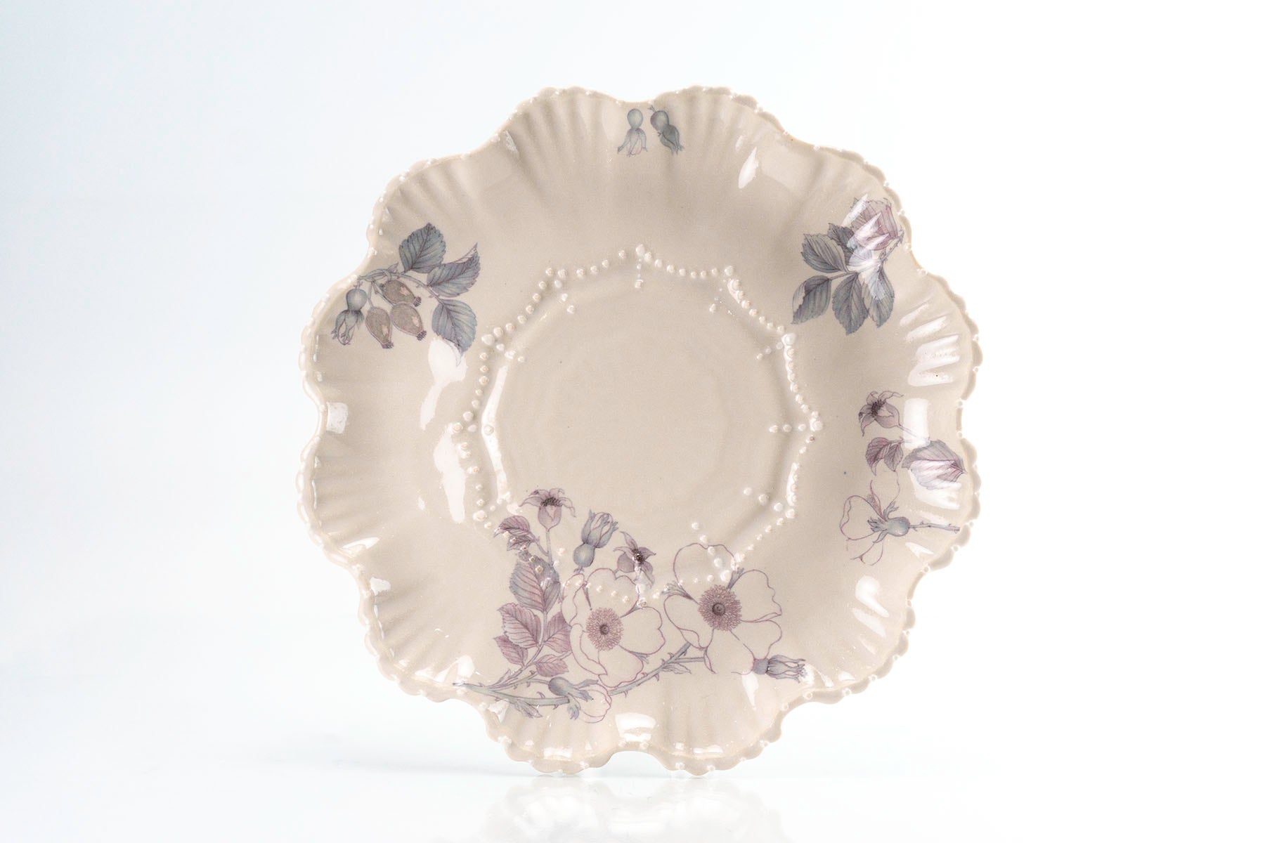 Descripció Plat mitjà rodó, 22 cm (8 5/8") de diàmetre, 1 cm (3/8") d'alçada, gres, fet a mà, con 6 oxidació (1236ºC), esmalt blanc. |