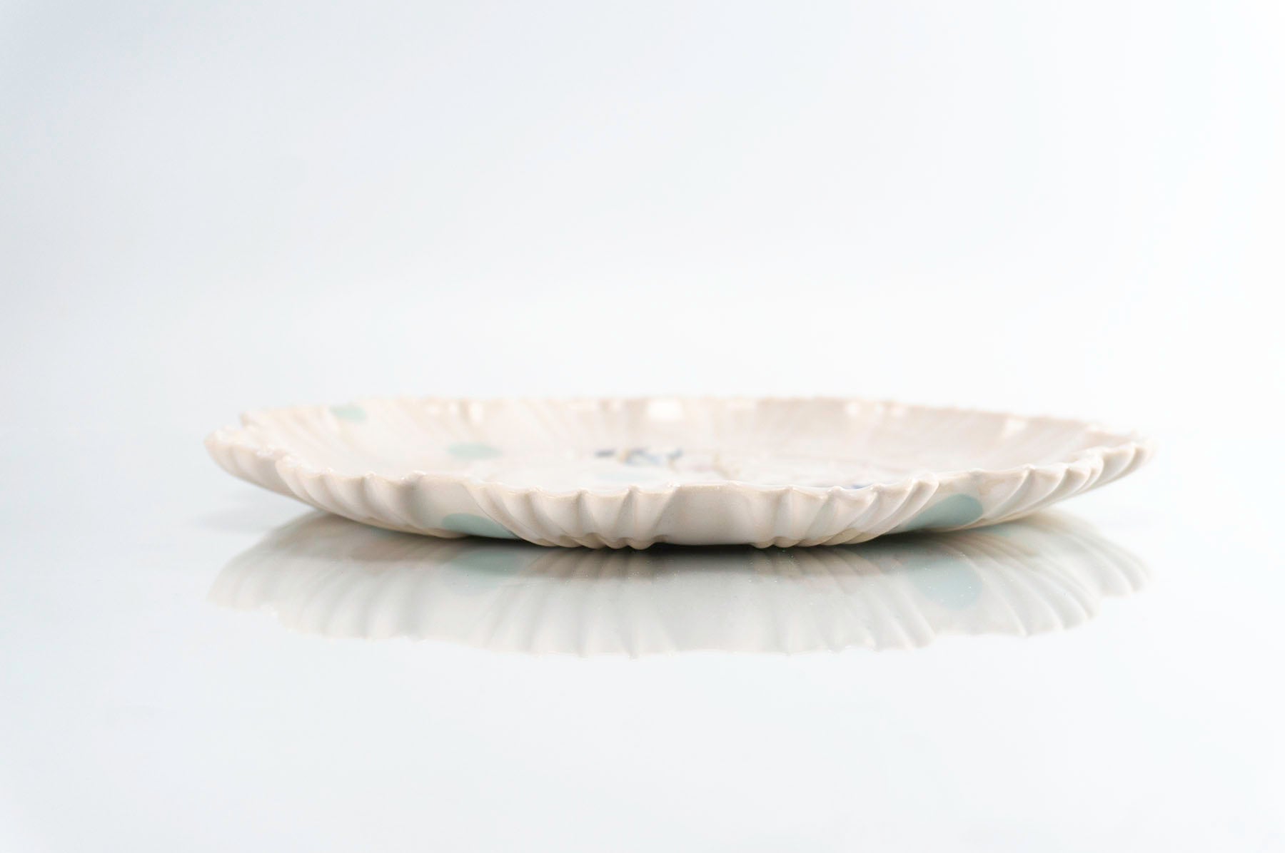 Descripció Plat mitjà rodó, 22 cm (8 5/8") de diàmetre, 1 cm (3/8") d'alçada, gres, fet a mà, con 6 oxidació (1236ºC), esmalt blanc. |