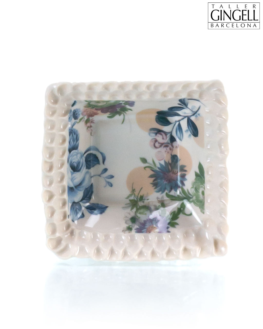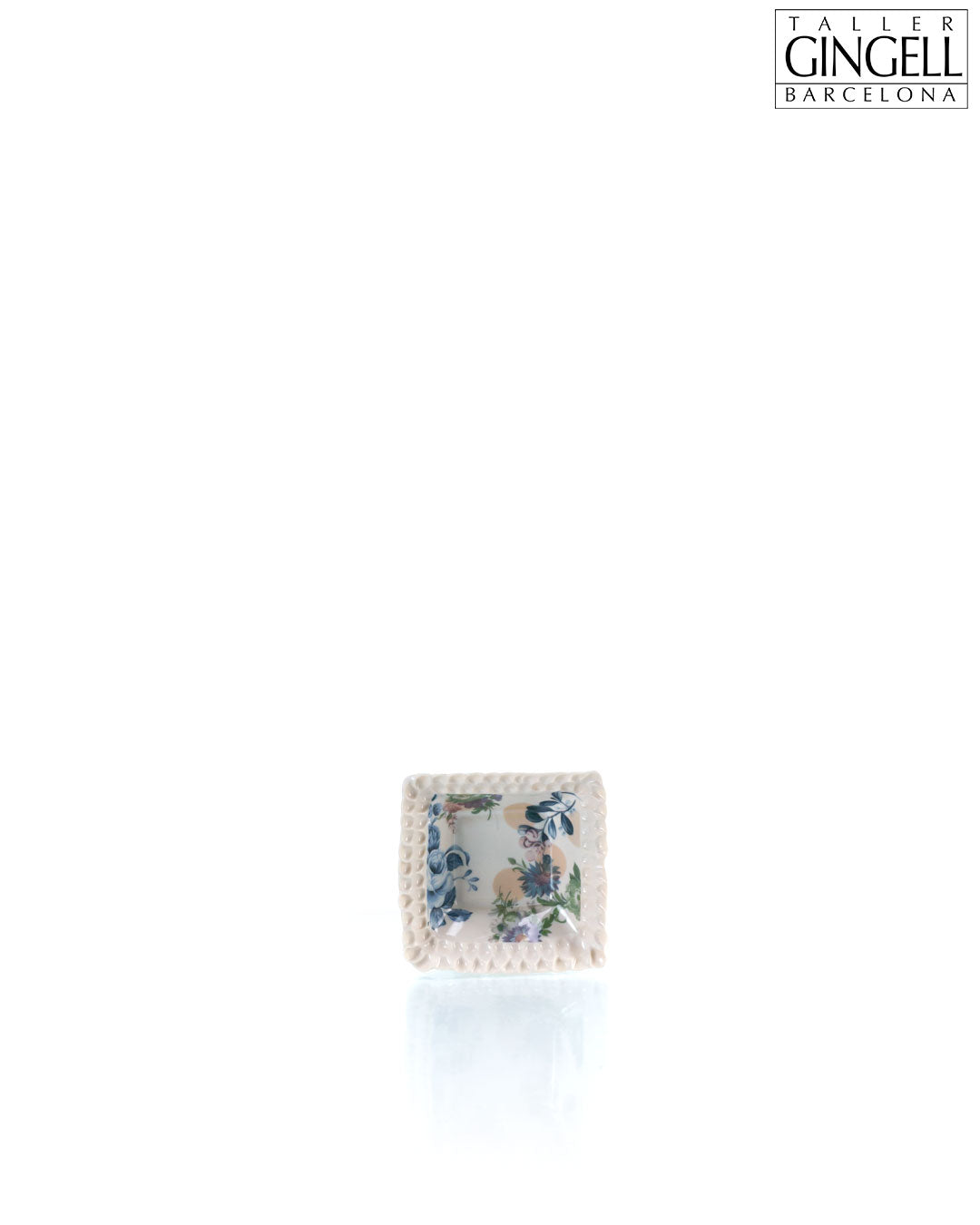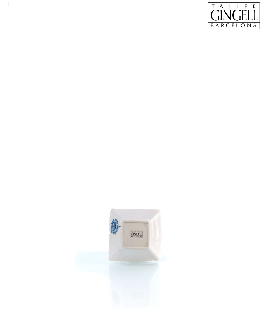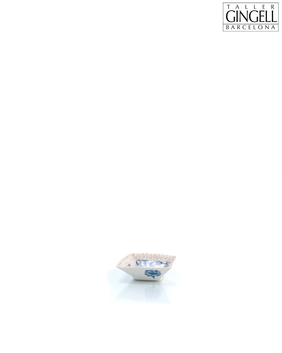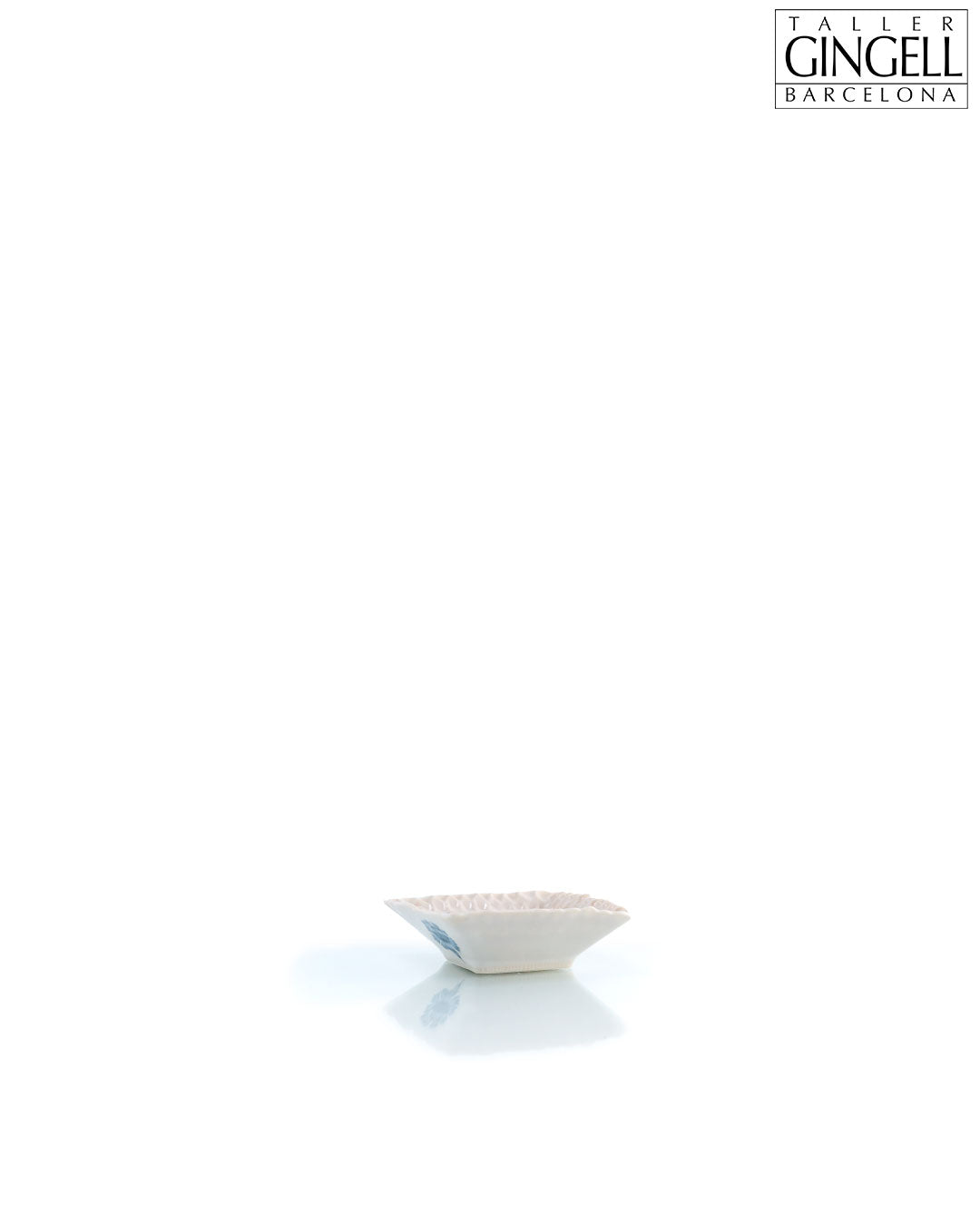 Descripció Plat quadrat petit, 9,5 cm (3 1/2") d'amplada, 3 cm (1 1/4") d'alçada, gres, fet a mà, oxidació con 6 (1236ºC), esmalt blanc. |