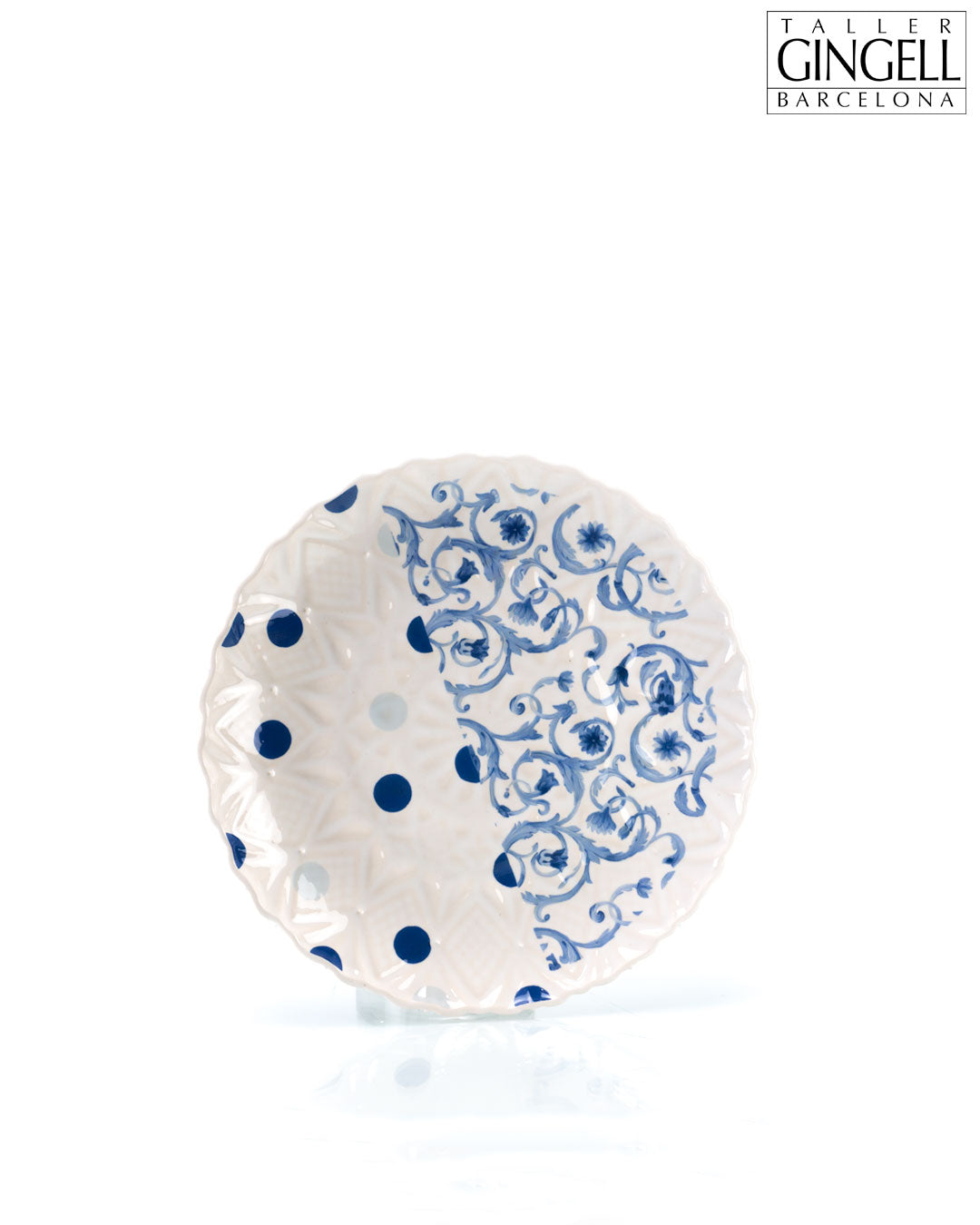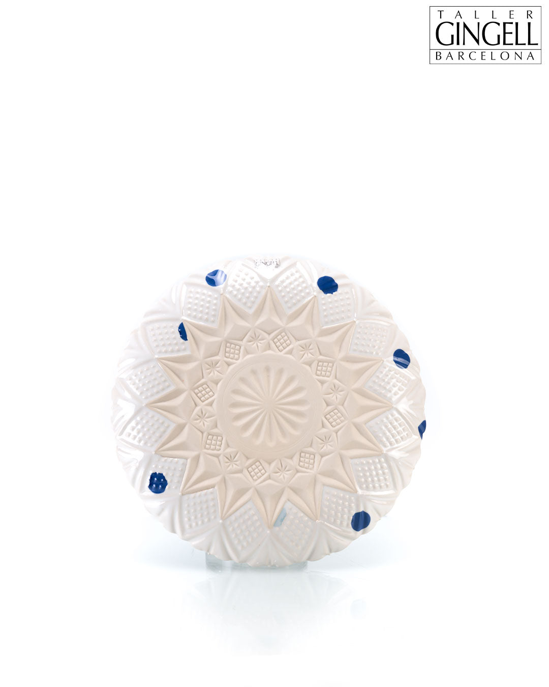 Descripció Plat modern gran de 24,5 cm (9 5/8") de diàmetre, 2 cm (5/8") d'alçada, gres blanc, fet a mà, con 6 oxidació (1236ºC), esmalt blanc, 313 grams. |