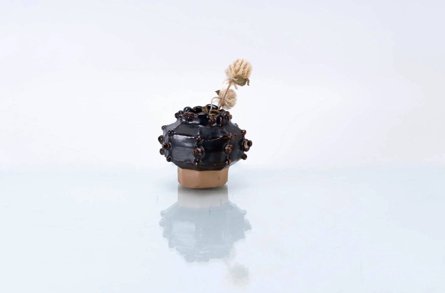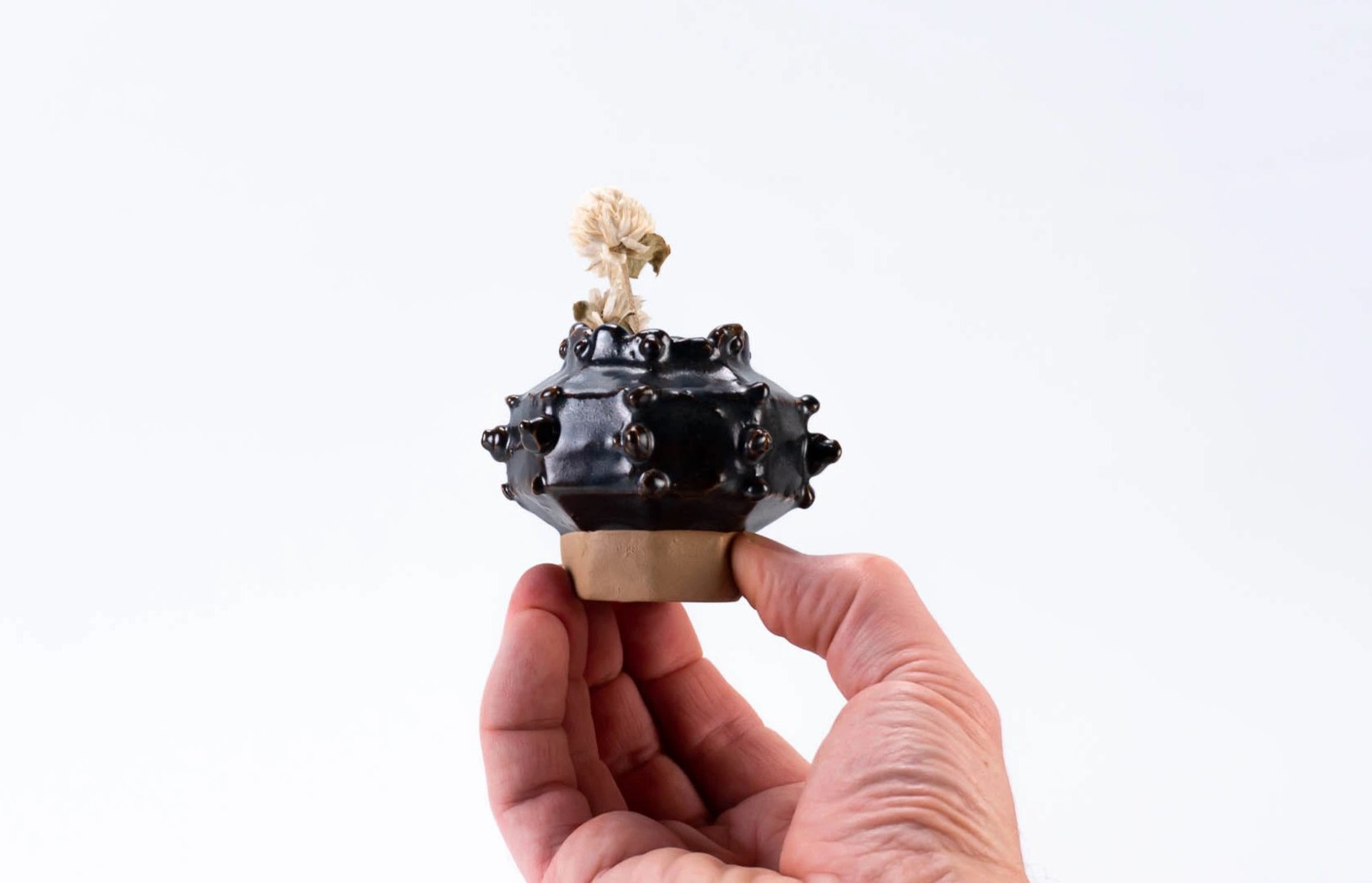 Descripción Florero pequeño redondo, 7 cm (3") de diámetro, 6 cm (2 3/8") de altura, gres, hecho a mano, cono 6 oxidación (1236ºC), esmalte marrón. (Flor seca - planta no incluida con el jarrón). |