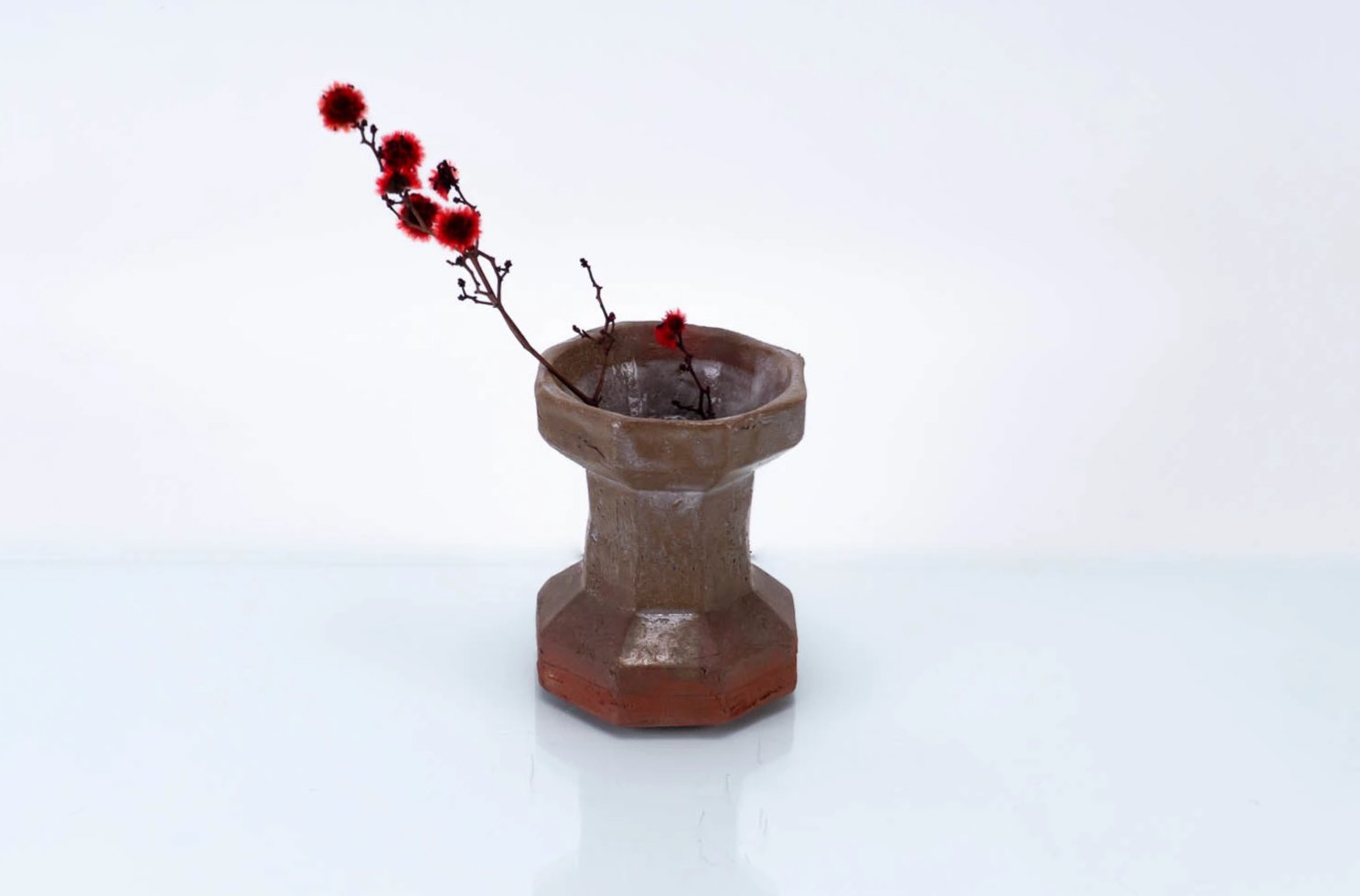 Descripción Florero pequeño, 7 cm (2 3/4") de diámetro, 8 cm (3 1/8") de altura, gres, hecho a mano, cono 6 oxidación (1236ºC), esmalte blanco. (Flor seca - planta no incluida con el jarrón). |