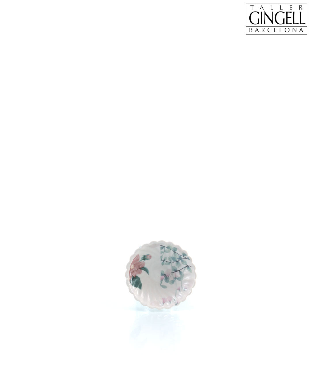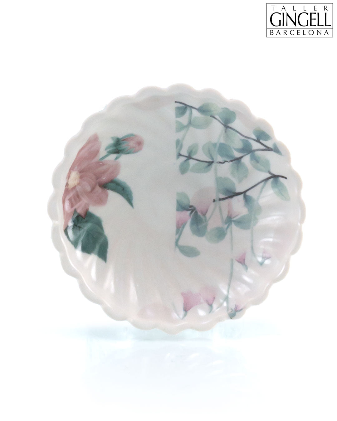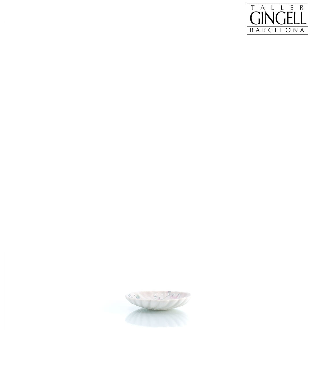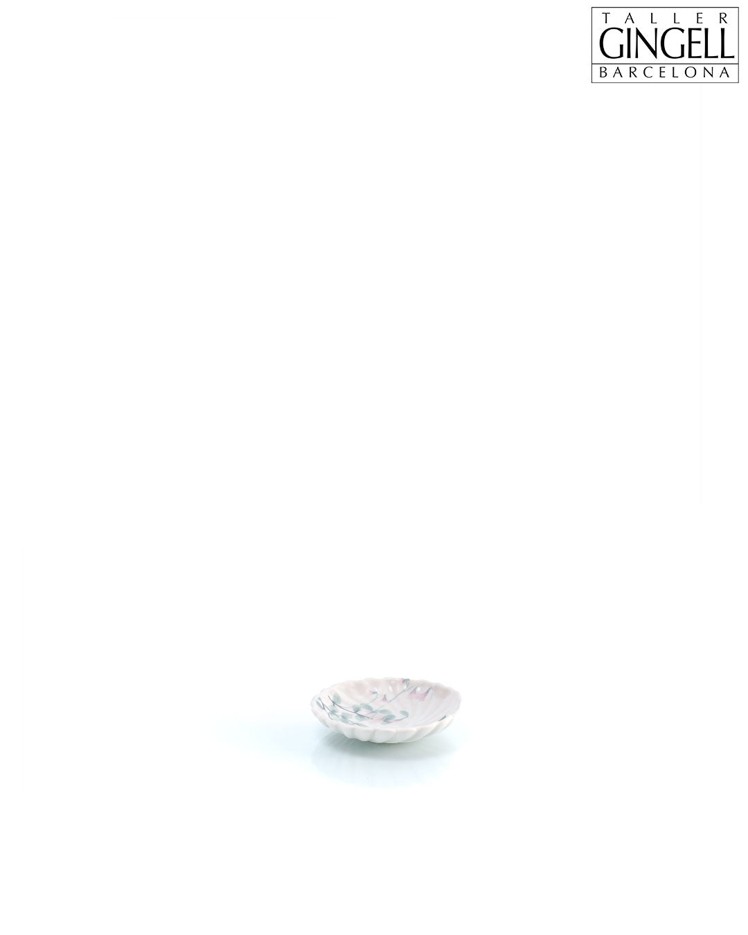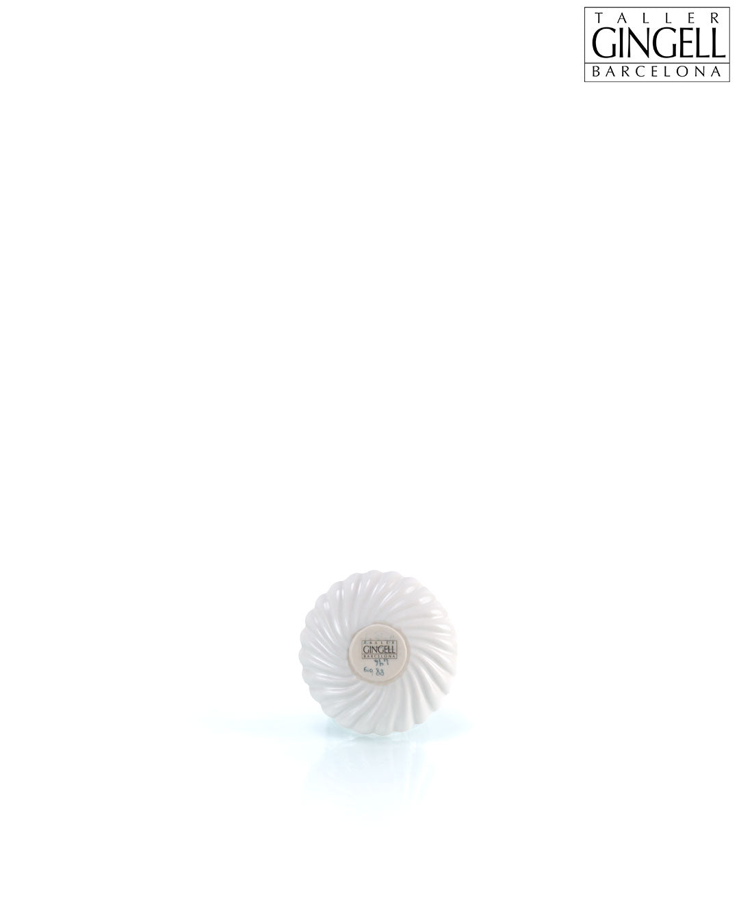 Description Petit plat rond, 9,5 cm (3 1/2") de diamètre, 2 cm (3/4") deHauteur, en grès, fait à la main, oxydation cône 6 (1236ºC), glaçure blanc. |