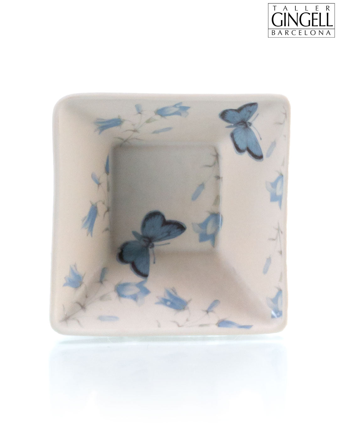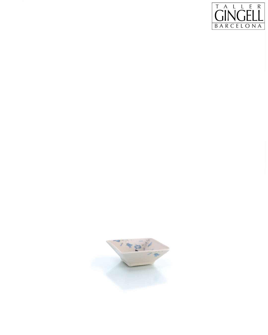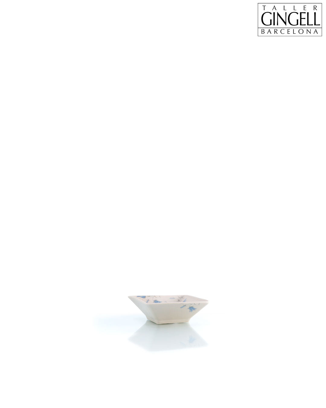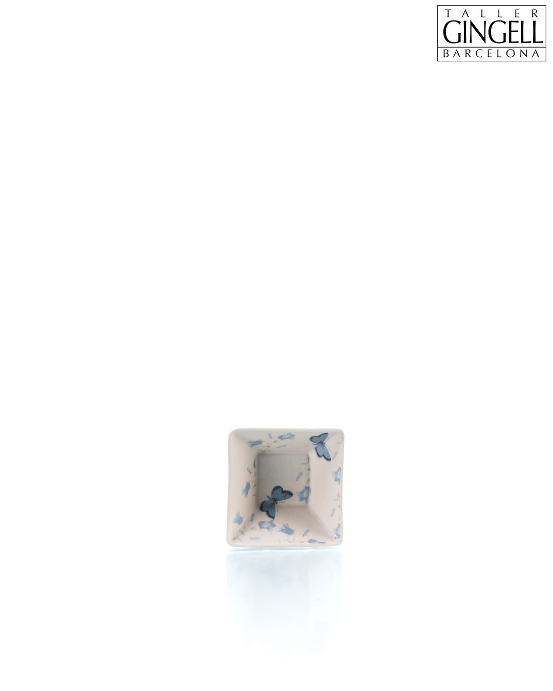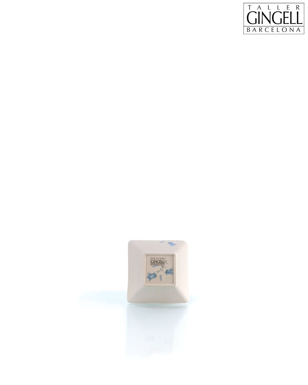 Description Petit plat carré, 9,5 cm (3 1/2") de largeur, 3 cm (1 1/4") deHauteur, en grès, fait main, oxydation cône 6 (1236ºC), glaçure blanc mat. |