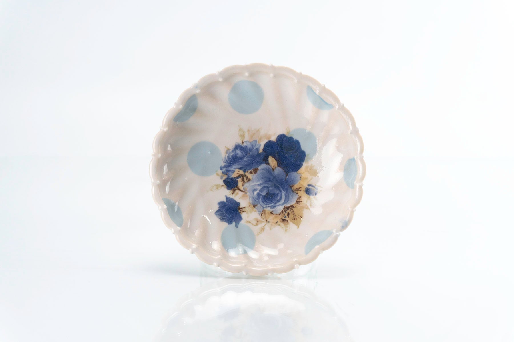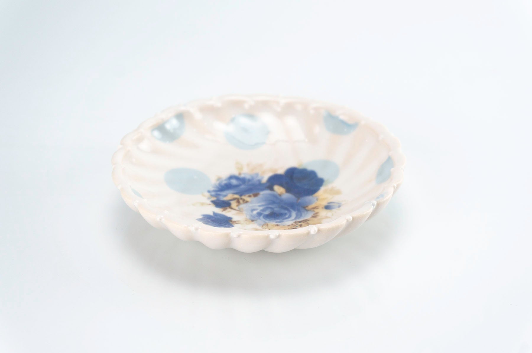 Description Small round dish, 9,5 cm (3 1/2") in diameter, 2 cm (3/4") in height, stoneware, handmade, cone 6 oxidation (1236ºC), white glaze. |