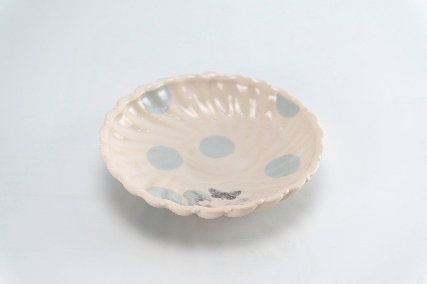 Description Small round dish, 9,5 cm (3 1/2") in diameter, 2 cm (3/4") in height, stoneware, handmade, cone 6 oxidation, white glaze. |