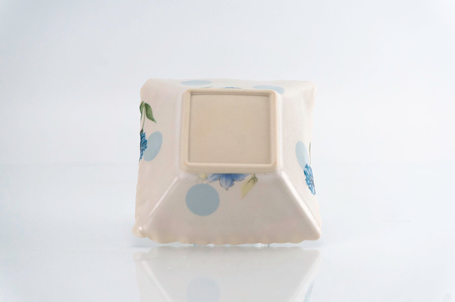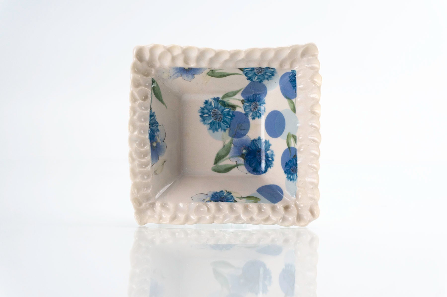 Description Small square dish, 9,5 cm (3 1/2") in width, 3 cm (1 1/4") in height, stoneware, handmade, cone 6 oxidation (1236ºC), white glaze. |