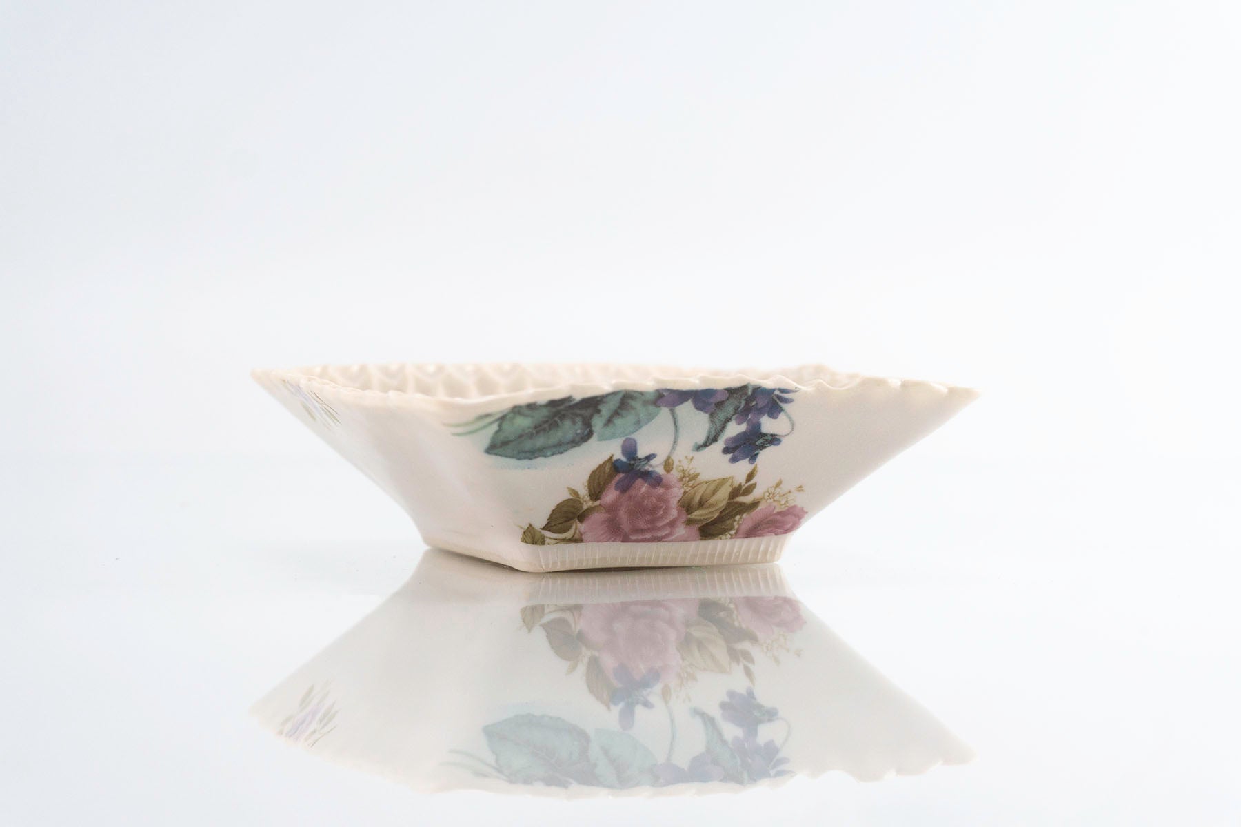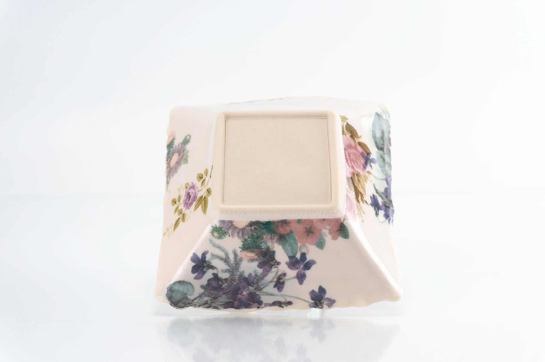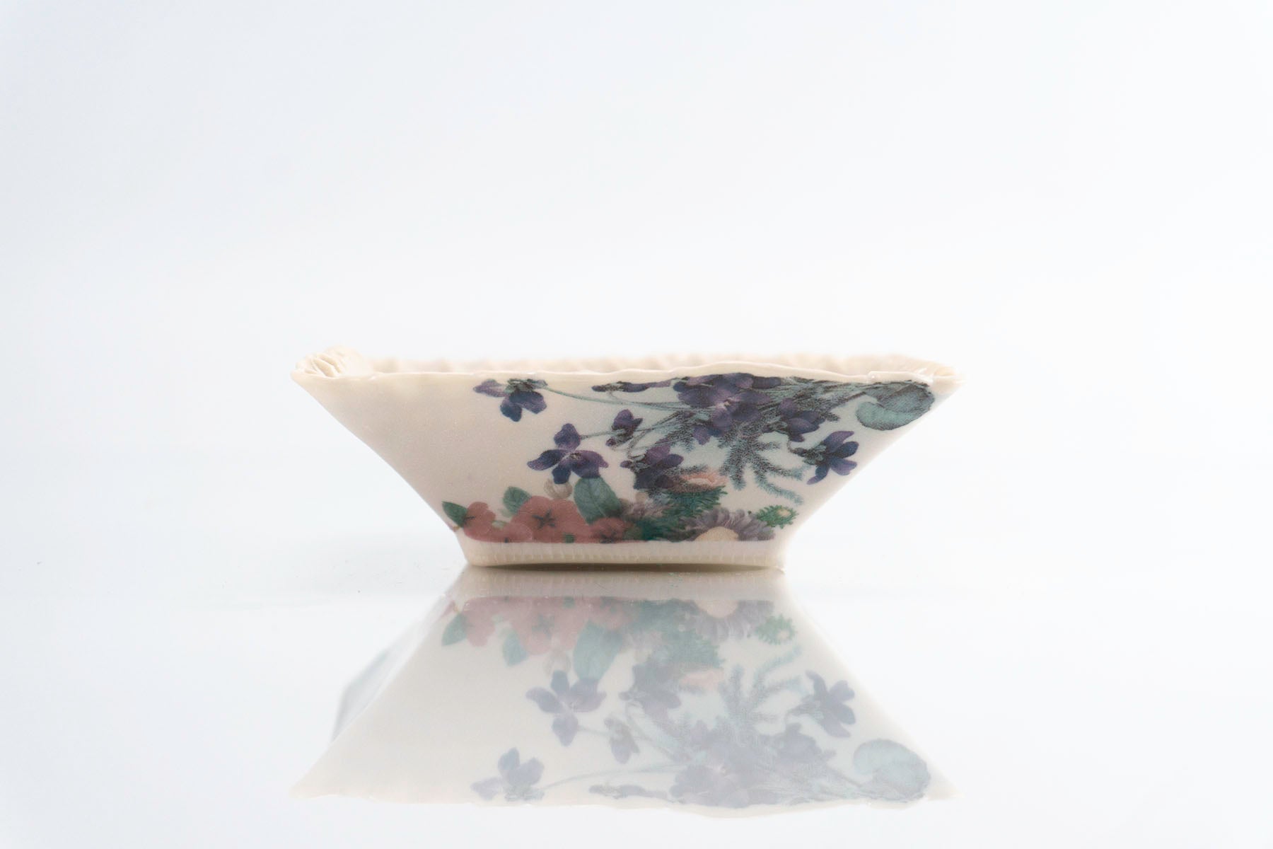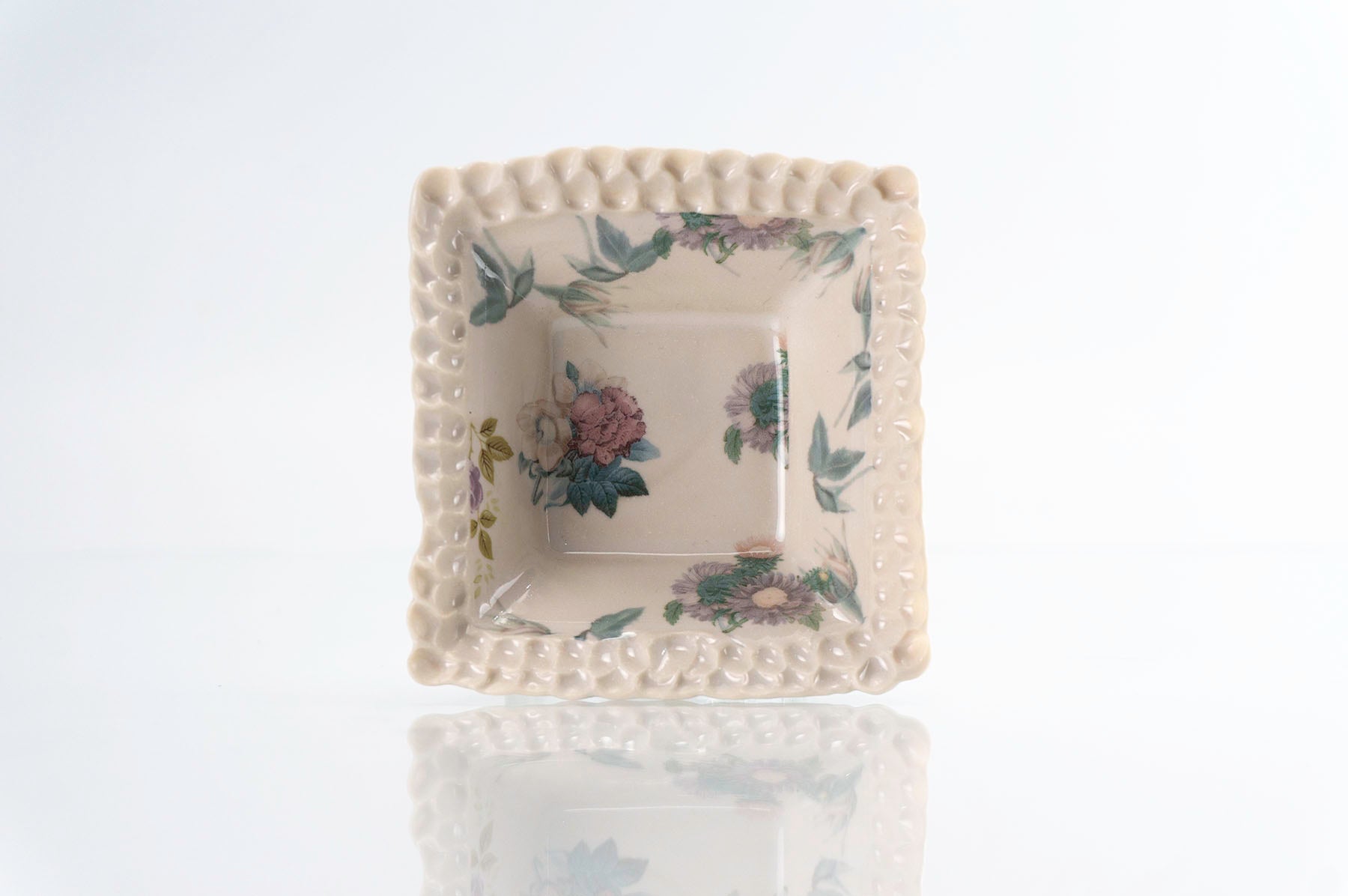 Description Small square dish, 9,5 cm (3 1/2") in width, 3 cm (1 1/4") in height, stoneware, handmade, cone 6 oxidation (1236ºC), white glaze. |