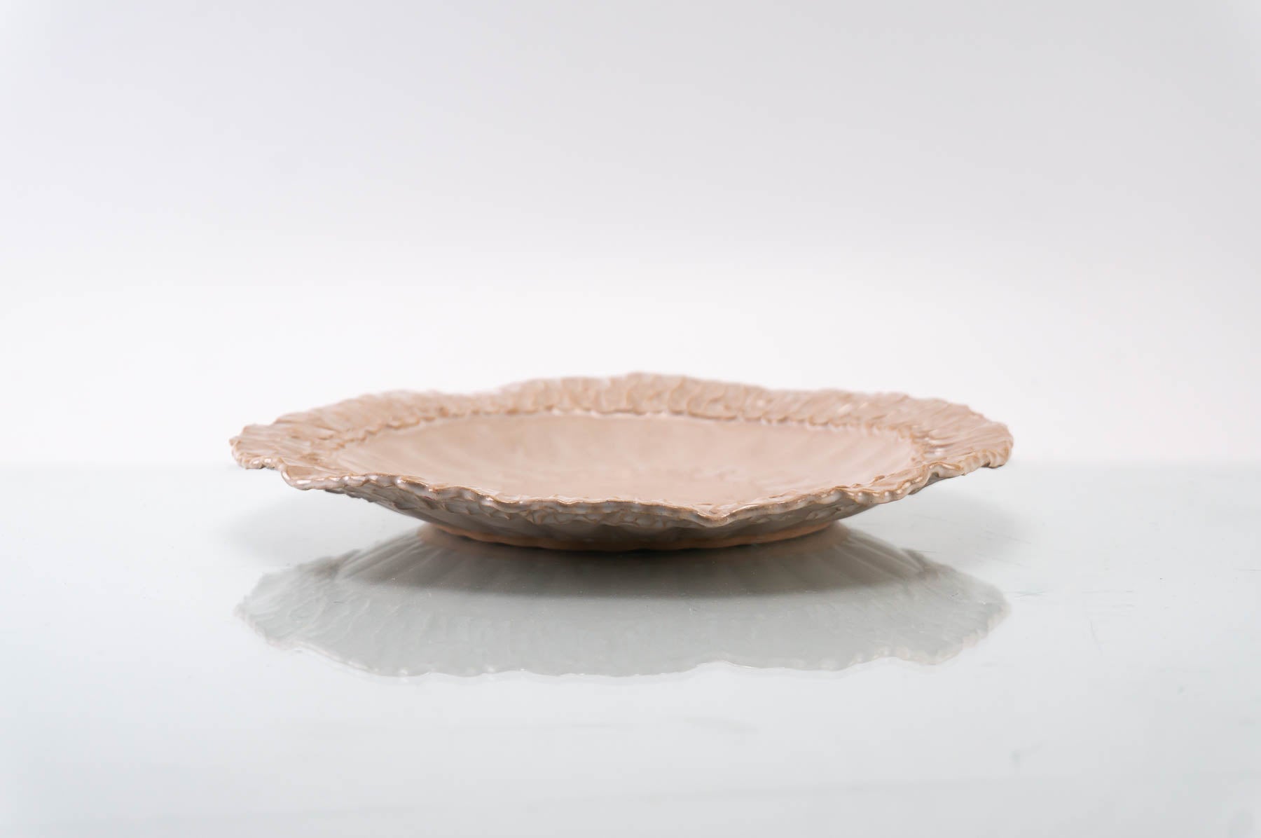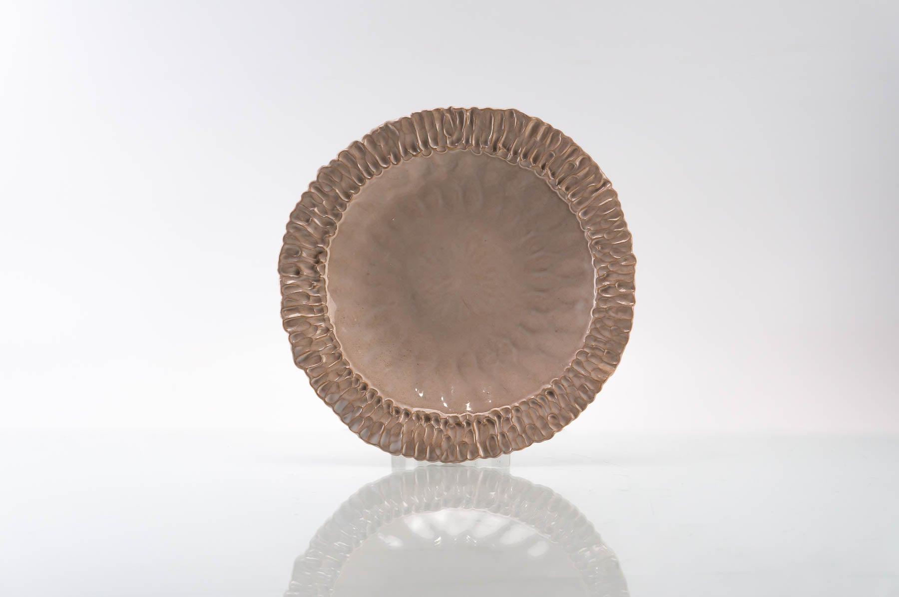 Description Medium Rimmed Plate | Lunch Plate | Medium Plate Medium rimmed plate 24 cm (9 1/2") in diameter, 3 cm (1 1/4") in height, red stoneware, hand-built, cone 6 oxidation (1236ºC), white glaze. |